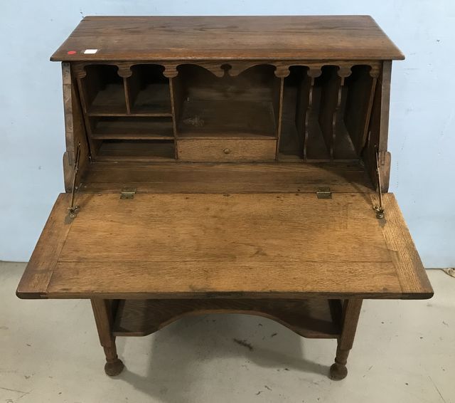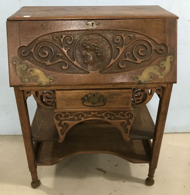 Antique Oak Secretary desk, drop front writing desk, carved portrait design, divided storage, single drawer, 40"h., 31"w. 17"d. Antique Oak Secretary desk, drop front writing desk, carved portrait design, divided storage, single drawer, 40"h., 31"w. 17"d.