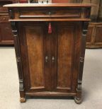 Antique Victorian Double Door Display Cabinet, this piece needs work, single drawer, glass shelves, with mirror back, has cracks, one door needs a tap bracket, has a different foot one front, walnut, 53"h., 37"w., 18"d. Antique Victorian Double Door Display Cabinet, this piece needs work, single drawer, glass shelves, with mirror back, has cracks, one door needs a tap bracket, has a different foot one front, walnut, 53"h., 37"w., 18"d.