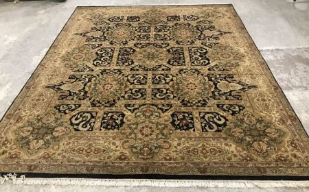 Black and Gold Hand Woven Wool Rug, multi colors, floral pattern, good condition, 8'1 x 10'3. Color will appear lighter in the photo. Black and Gold Hand Woven Wool Rug, multi colors, floral pattern, good condition, 8'1 x 10'3. Color will appear lighter in the photo.