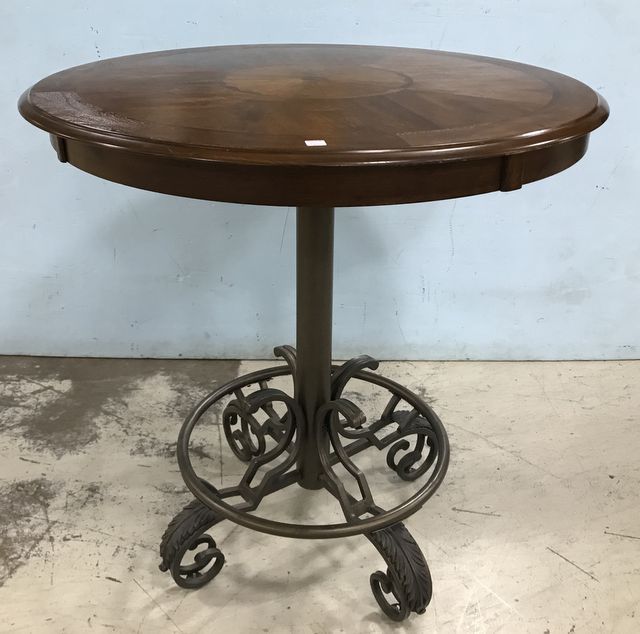 Modern Tall Round Top Table, metal pedestal base with foot rest, cherry round top, 41"h., 40"w. Modern Tall Round Top Table, metal pedestal base with foot rest, cherry round top, 41"h., 40"w.