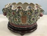 Decorative Chinese Center Piece Bowl, modern decor, crimped rim with wood base, hand painted, 6"h., 11"w. Decorative Chinese Center Piece Bowl, modern decor, crimped rim with wood base, hand painted, 6"h., 11"w.