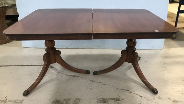 Vintage Mahogany Duncan Phyfe Dining Table, double pedestal, finish has scratches and wear, no leaves, 30"h., 60"long., 42"w. Vintage Mahogany Duncan Phyfe Dining Table, double pedestal, finish has scratches and wear, no leaves, 30"h., 60"long., 42"w.