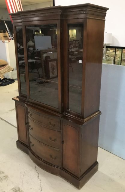 Mahogany Duncan Phyfe China Cabinet, two wood shelves, single glass door, three drawers, two doors, finish has some wear, 71"h., 45"w., 15"d. Mahogany Duncan Phyfe China Cabinet, two wood shelves, single glass door, three drawers, two doors, finish has some wear, 71"h., 45"w., 15"d.
