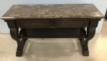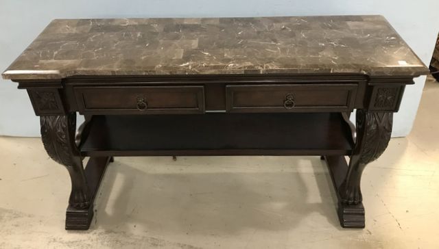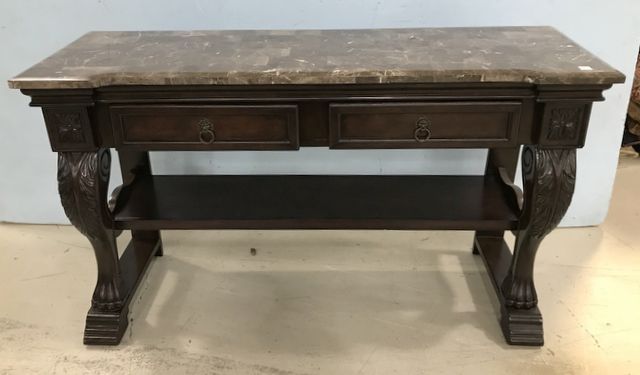 Antique Reproduction Carved Wall Console Table, faux granite top, two drawers, paw feet, two tier, good condition, 32"h., 56"w., 17"d. Antique Reproduction Carved Wall Console Table, faux granite top, two drawers, paw feet, two tier, good condition, 32"h., 56"w., 17"d.