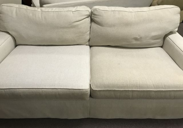 CR Laine Upholstery Designer Sofa, two cushions, eggshell white, needs cleaning, has some dirt, 6'9 long, 31"d. CR Laine Upholstery Designer Sofa, two cushions, eggshell white, needs cleaning, has some dirt, 6'9 long, 31"d.