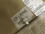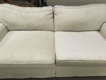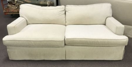 CR Laine Upholstery Designer Sofa, two cushions, eggshell white, needs cleaning, has some dirt, 6'9 long, 31"d. CR Laine Upholstery Designer Sofa, two cushions, eggshell white, needs cleaning, has some dirt, 6'9 long, 31"d.
