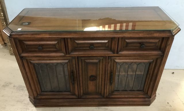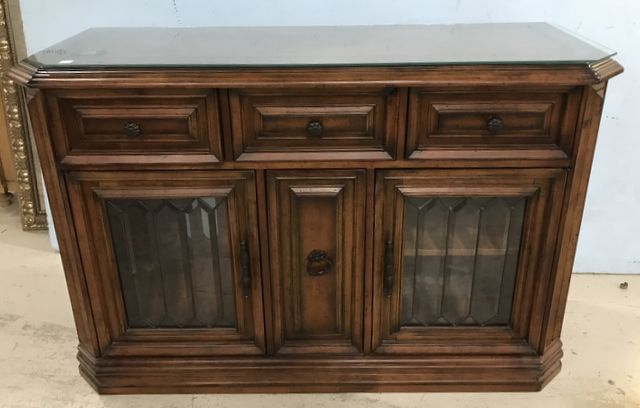 Aspenhome TV Console Cabinet, cherry finish, three drawers, leaded glass doors, well made, heavy, included glass top, 36"h., 56"w., 21"d. Aspenhome TV Console Cabinet, cherry finish, three drawers, leaded glass doors, well made, heavy, included glass top, 36"h., 56"w., 21"d.