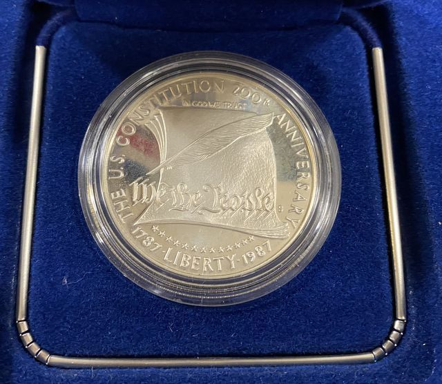 U.S. Constitution 200th Anniversary 1987 Silver Dollar, Proof, San Francisco Mint, 90 % silver, with Certificate of Authenticity, with case. U.S. Constitution 200th Anniversary 1987 Silver Dollar, Proof, San Francisco Mint, 90 % silver, with Certificate of Authenticity, with case.