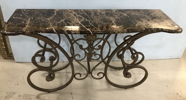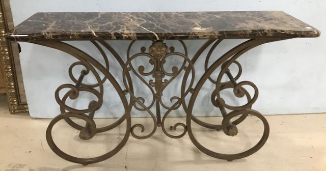 Console marble top table with ornate metal base, like new, includes glass top, 33"h., 60"w., 18"d. Console marble top table with ornate metal base, like new, includes glass top, 33"h., 60"w., 18"d.