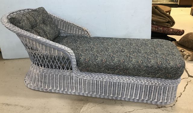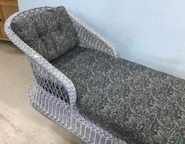 Light Blue Wicker style lounger, has upholstered cushions. Light Blue Wicker style lounger, has upholstered cushions.