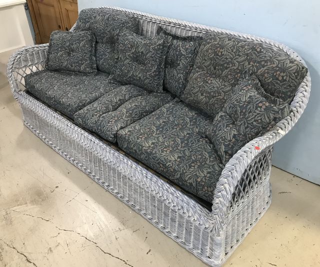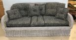 Light Blue Wicker style sofa, upholstered cushions. Light Blue Wicker style sofa, upholstered cushions.