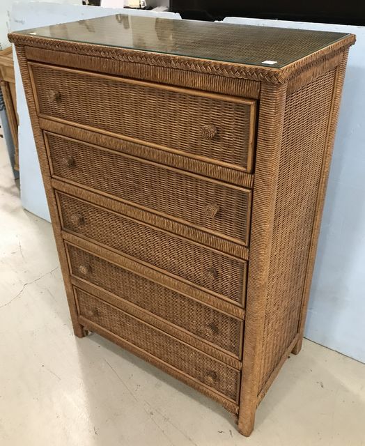 Henry Link "Wicker" Chest of Drawers, five drawers, glass inset top, good condition, 48"h., 34"w., 19"d. Henry Link "Wicker" Chest of Drawers, five drawers, glass inset top, good condition, 48"h., 34"w., 19"d.
