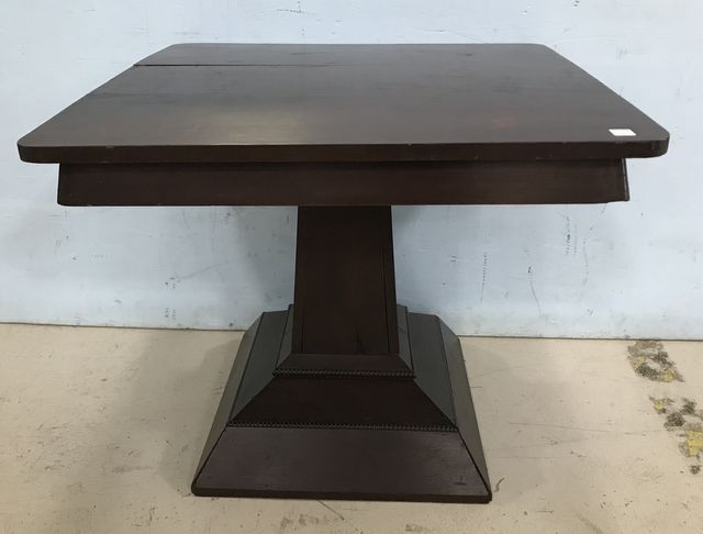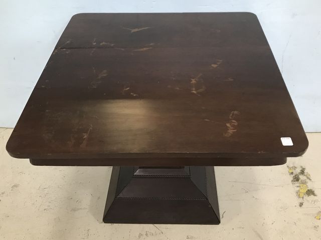 Antique Empire Style Square Top Side Table, dark mahogany, pedestal base, has worn spots, 27"h., 31"w. Antique Empire Style Square Top Side Table, dark mahogany, pedestal base, has worn spots, 27"h., 31"w.