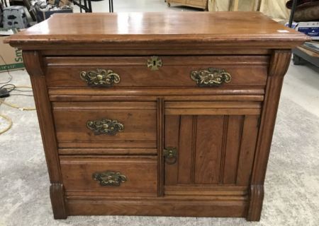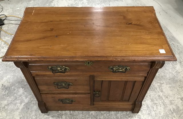 Vintage Oak Wash Stand, single door, three drawers, has slight age wear, 27"h., 32"w., 18"d. Vintage Oak Wash Stand, single door, three drawers, has slight age wear, 27"h., 32"w., 18"d.