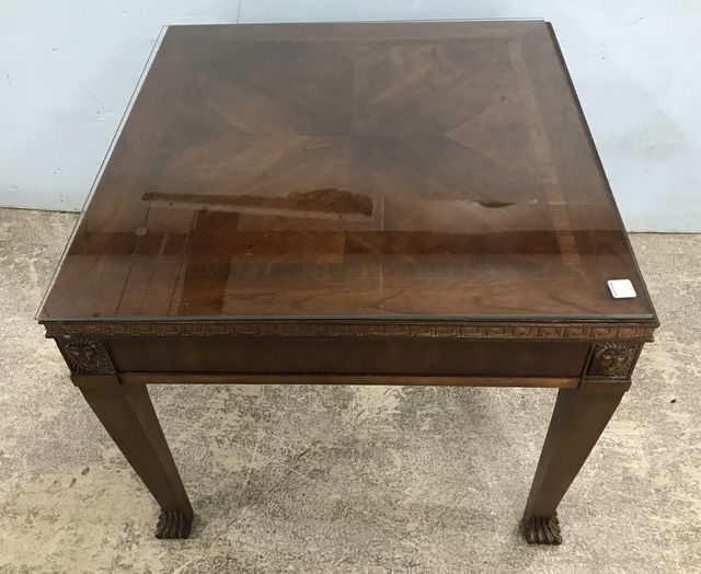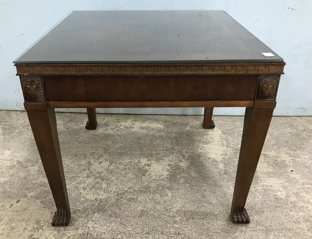 Modern banded square lamp table, paw feet with lion heads on sides, included glass top, cherry finish, 23"h., 27"w. Modern banded square lamp table, paw feet with lion heads on sides, included glass top, cherry finish, 23"h., 27"w.