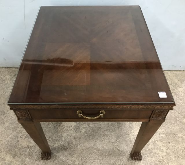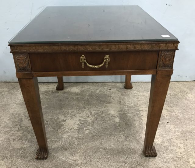 Modern Banded lamp table with single drawer, paw feet with lion heads on sides, included glass top, cherry finish, 23"h., 23"w., 27"d. Modern Banded lamp table with single drawer, paw feet with lion heads on sides, included glass top, cherry finish, 23"h., 23"w., 27"d.