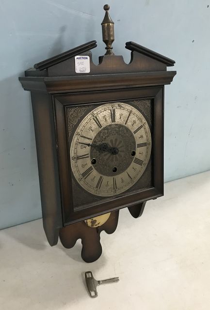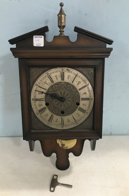 Vintage Linden Wall Clock, cherry case, has pendulum, has key, 21"h. Vintage Linden Wall Clock, cherry case, has pendulum, has key, 21"h.