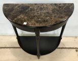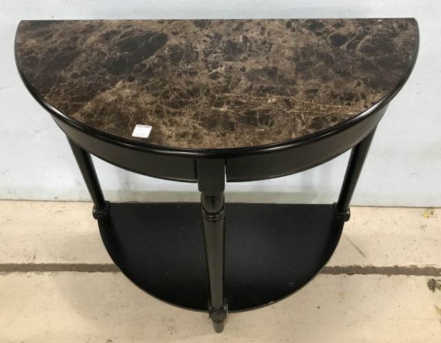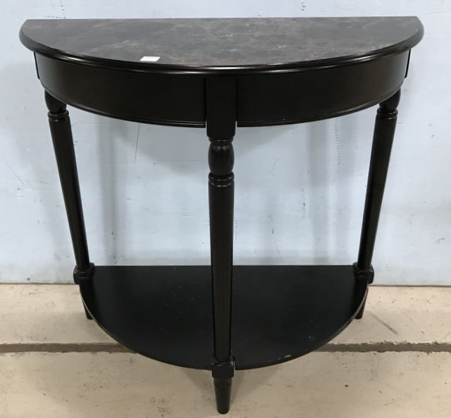 New Half Round Faux Marble Top Console Table, two tier, black finish, has usage wear, 30"h., 30"w., 14"d. New Half Round Faux Marble Top Console Table, two tier, black finish, has usage wear, 30"h., 30"w., 14"d.