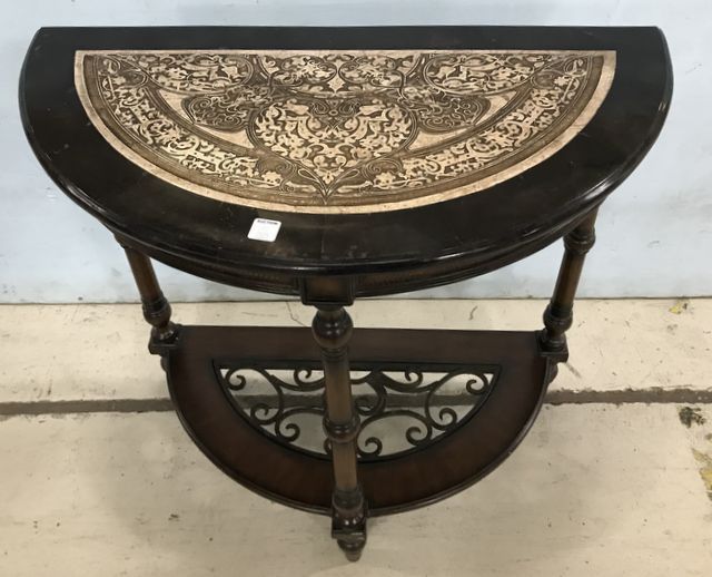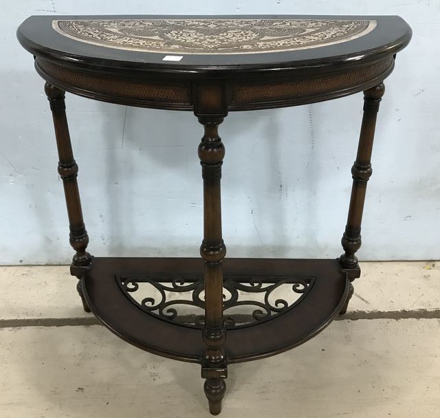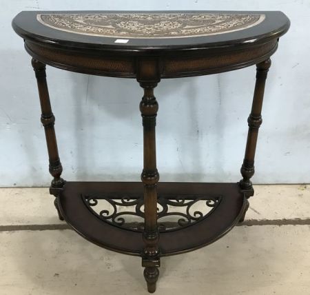 New Half Moon Edwardian Style Console Table, cherry finish, inlaid top design, two tier, has scratches and wear, 30"h., 29"w., 15"d. New Half Moon Edwardian Style Console Table, cherry finish, inlaid top design, two tier, has scratches and wear, 30"h., 29"w., 15"d.