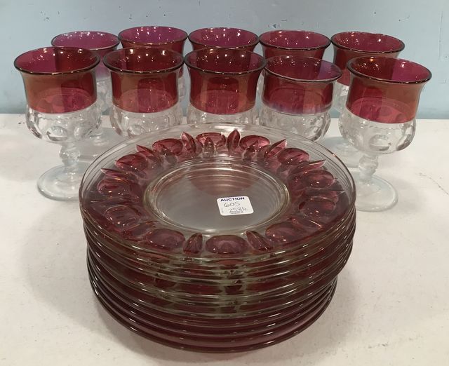 Indiana Kings Crown Red Ruby Goblets, 10 total, and 10 Plates, 8 1/2"dia. Some have usage wear. Indiana Kings Crown Red Ruby Goblets, 10 total, and 10 Plates, 8 1/2"dia. Some have usage wear.