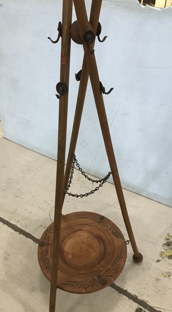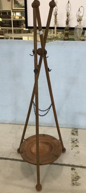 Vintage Oak Tepee Style Coat Rack, has center umbrella holder, 61"h. Vintage Oak Tepee Style Coat Rack, has center umbrella holder, 61"h.