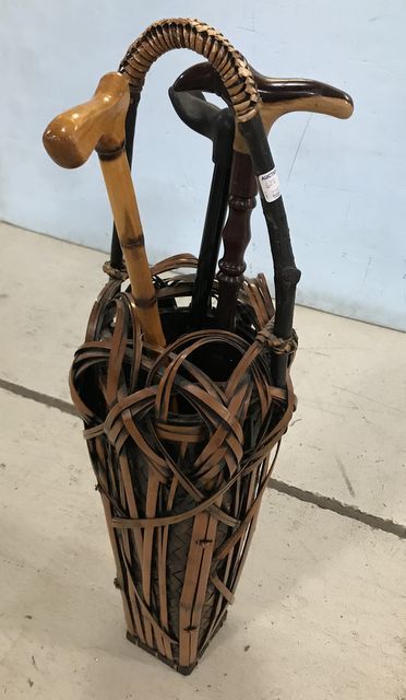 Woven Style Decorative Basket with Three Walking Canes, modern decor, 40"h. Woven Style Decorative Basket with Three Walking Canes, modern decor, 40"h.