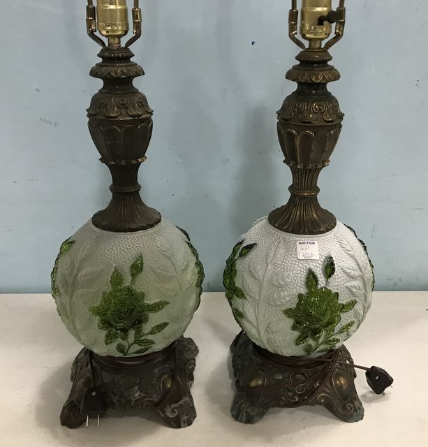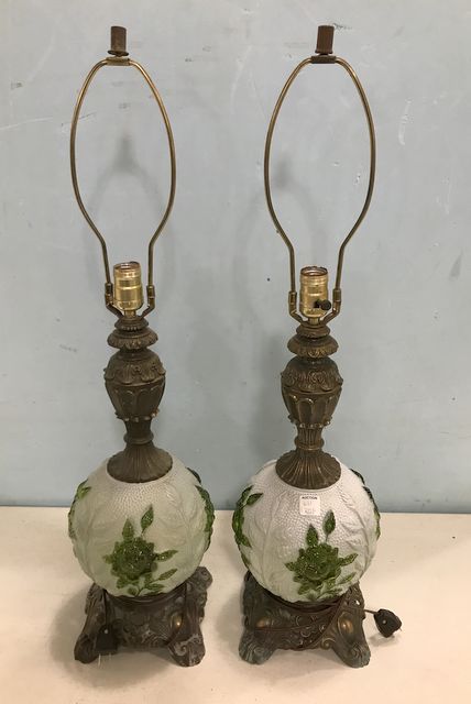 Pair of Vintage Art Deco Table Lamps, colorful glass globes, brass frame and footed, no shades, 31"h. Pair of Vintage Art Deco Table Lamps, colorful glass globes, brass frame and footed, no shades, 31"h.