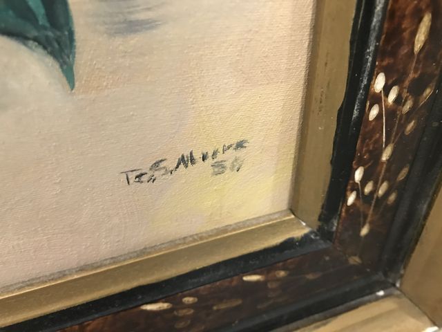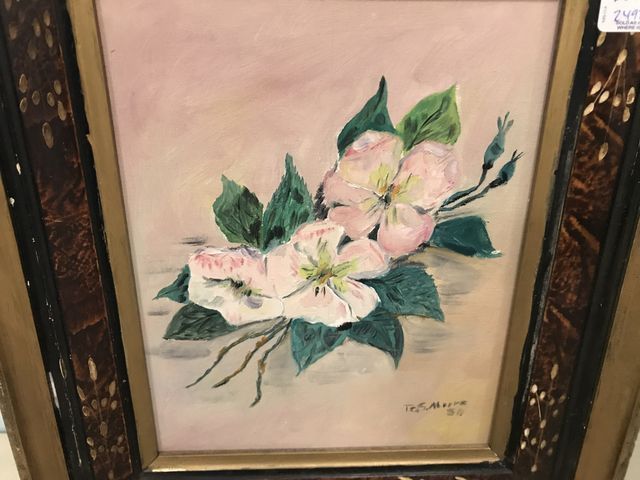 G.S. Moore 1950 Still Life Floral Painting, painting on board, frame is worn, 14"h., 12"w. G.S. Moore 1950 Still Life Floral Painting, painting on board, frame is worn, 14"h., 12"w.