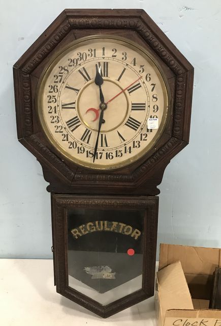 Antique Regulator Wall Clock, oak, needs work, has pendulum, key, bottom needs to be put back together, 32"h. 17"w. Antique Regulator Wall Clock, oak, needs work, has pendulum, key, bottom needs to be put back together, 32"h. 17"w.