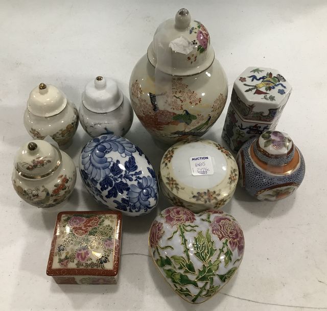 Group of Oriental Pottery Vases, hand painted Chinese and Japanese vases, blue and white egg, trinket boxes, Cloisonné style heart box. Group of Oriental Pottery Vases, hand painted Chinese and Japanese vases, blue and white egg, trinket boxes, Cloisonné style heart box.