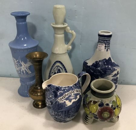 Two Avon decanters, Ashley Belle blue and white vase, Staffordshire Ware "Shepard of the Hills" pitcher, etched brass vase, Mexico pottery footed vase. Two Avon decanters, Ashley Belle blue and white vase, Staffordshire Ware "Shepard of the Hills" pitcher, etched brass vase, Mexico pottery footed vase.