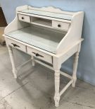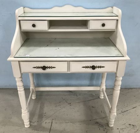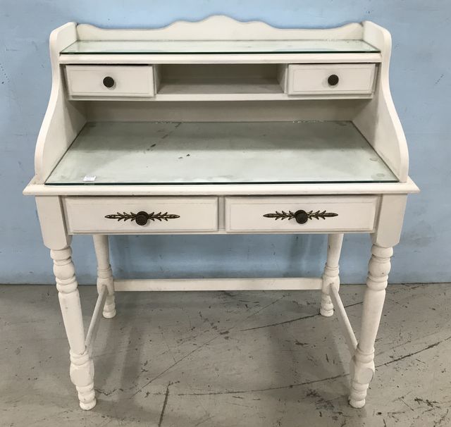 White painted writing desk, four drawers, two glass tops, light wear, 41"h., 36"w., 20"d. White painted writing desk, four drawers, two glass tops, light wear, 41"h., 36"w., 20"d.
