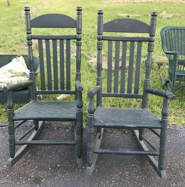 Pair of Painted Wood Patio Rocking Chairs , spindle back, woven seats. Pair of Painted Wood Patio Rocking Chairs , spindle back, woven seats.
