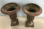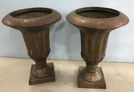 Pair of Copper Urn Planters, out door decor, used condition, 27"h., 20"dia. Pair of Copper Urn Planters, out door decor, used condition, 27"h., 20"dia.