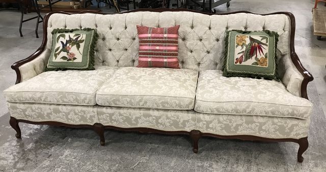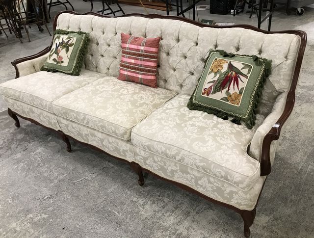 French Style Vintage Three Cushion Sofa, cherry frame, white floral upholstery, 7"ft. French Style Vintage Three Cushion Sofa, cherry frame, white floral upholstery, 7"ft.
