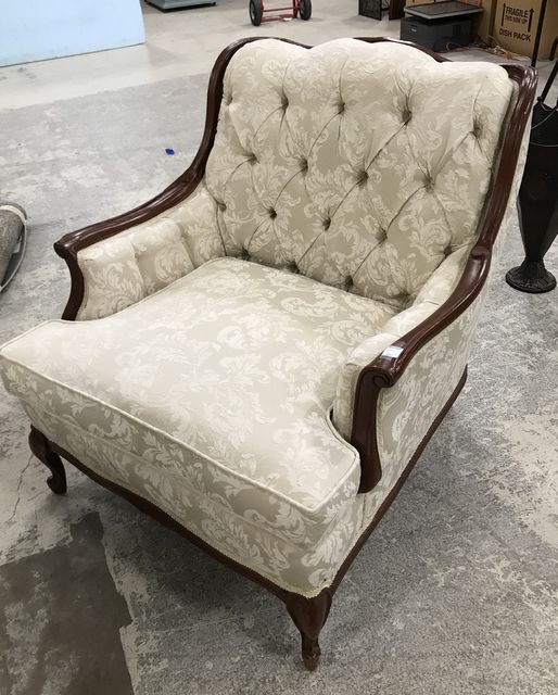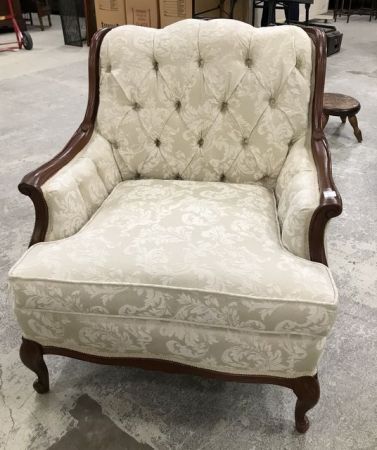 French Style Vintage Arm Chair, cherry frame, white floral upholstery. French Style Vintage Arm Chair, cherry frame, white floral upholstery.