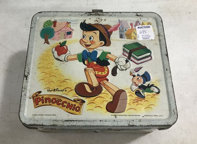 Walt Disney's Pinocchio Lunch Box, missing thermos, has age wear, 8"w. Walt Disney's Pinocchio Lunch Box, missing thermos, has age wear, 8"w.