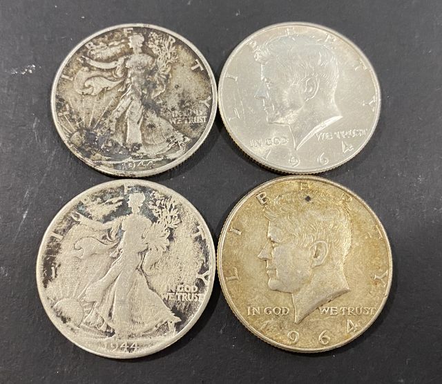 Two 1964 Kennedy Half Dollars and Two 1944 Walking Liberty Half Dollars. Two 1964 Kennedy Half Dollars and Two 1944 Walking Liberty Half Dollars.