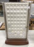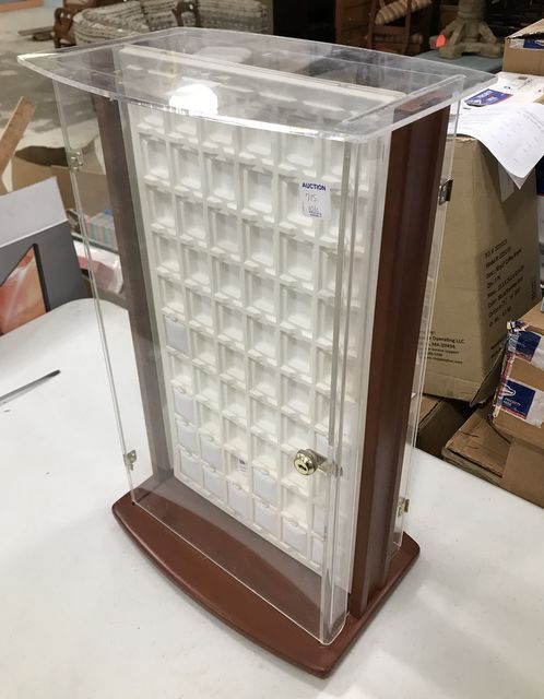 Plastic Earring Case Display, swivel stand, missing keys, is locked, 23"h., 14"w. Plastic Earring Case Display, swivel stand, missing keys, is locked, 23"h., 14"w.