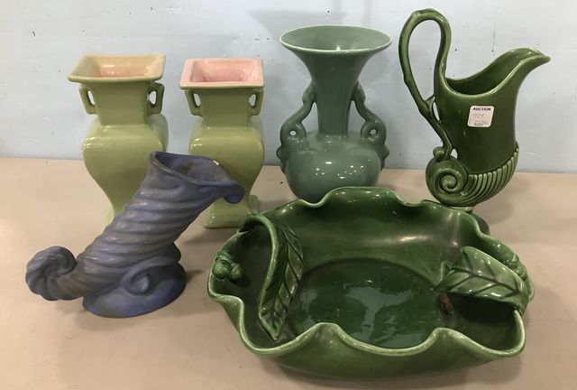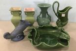 Group of hand made pottery pieces, green tray, pitcher, Niloak horn vase, pair of vases, green pitcher. Group of hand made pottery pieces, green tray, pitcher, Niloak horn vase, pair of vases, green pitcher.