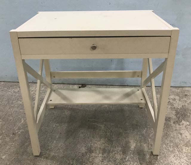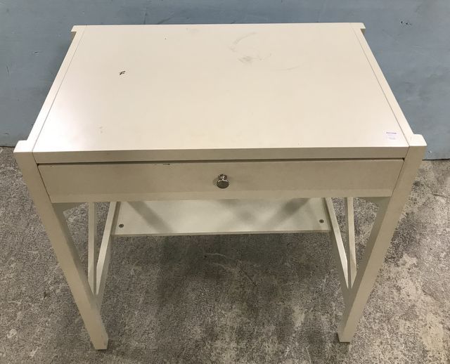 Modern white vanity/desk, single drawer, pressed wood, 30"h., 29"w., 20"d. Modern white vanity/desk, single drawer, pressed wood, 30"h., 29"w., 20"d.