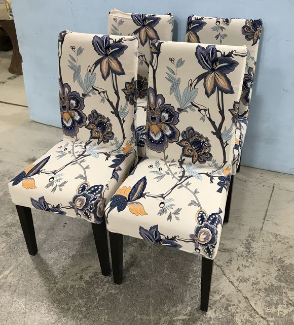 Four Multi Color Vinyl Chairs with floral slip covers, modern chairs, 39"h. Four Multi Color Vinyl Chairs with floral slip covers, modern chairs, 39"h.
