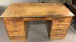 Vintage Oak kneehole office desk, 8 drawers, has wear on finish, include side extension mounts on side, 30"h., 59"w., 29"d. Vintage Oak kneehole office desk, 8 drawers, has wear on finish, include side extension mounts on side, 30"h., 59"w., 29"d.