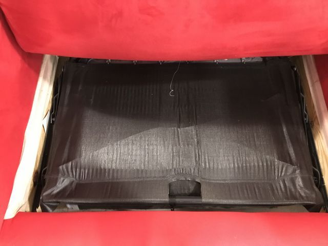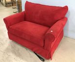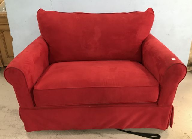 Large Like New Red Microsuede Love Seat, with pull out sleeper, 54"w., 39"d. Large Like New Red Microsuede Love Seat, with pull out sleeper, 54"w., 39"d.
