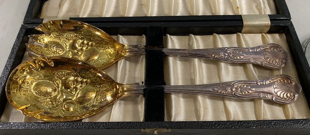 Weighted Sterling Candle Holder, 4 1/2"h. and Silver Plate Serving Set, Sheffield spoons with case. Weighted Sterling Candle Holder, 4 1/2"h. and Silver Plate Serving Set, Sheffield spoons with case.