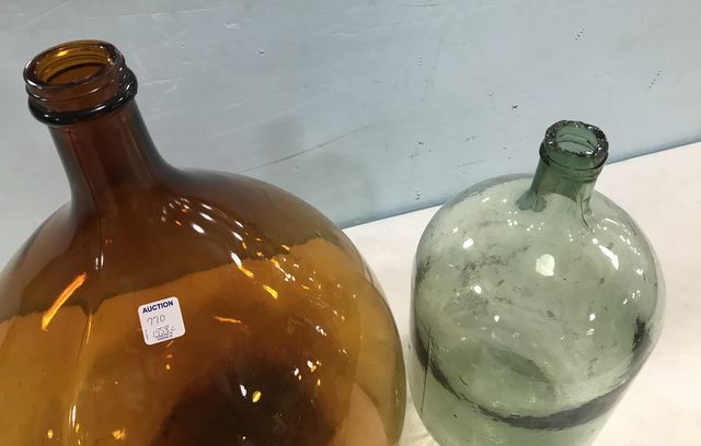 Large Amber Hand Blown Glass Vase and Hand Blown Jug, has chips on rim 17"h. Large Amber Hand Blown Glass Vase and Hand Blown Jug, has chips on rim 17"h.