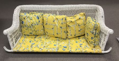 White Wicker Hanging Swing Bench, yellow upholstery, metal hooks, has some damage on one side, 5'3 long, 24"h. White Wicker Hanging Swing Bench, yellow upholstery, metal hooks, has some damage on one side, 5'3 long, 24"h.