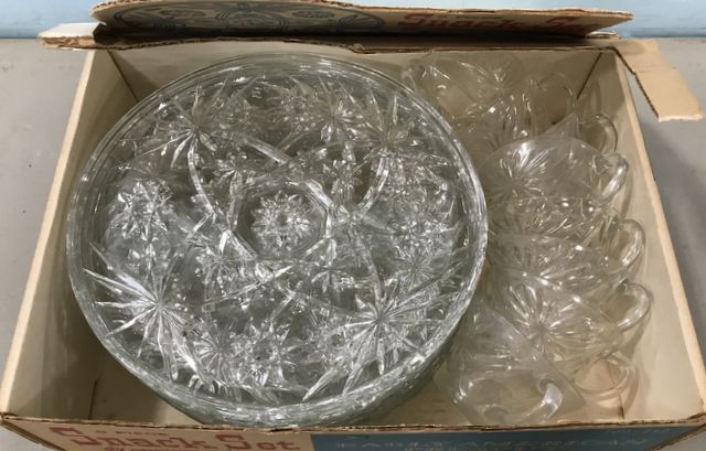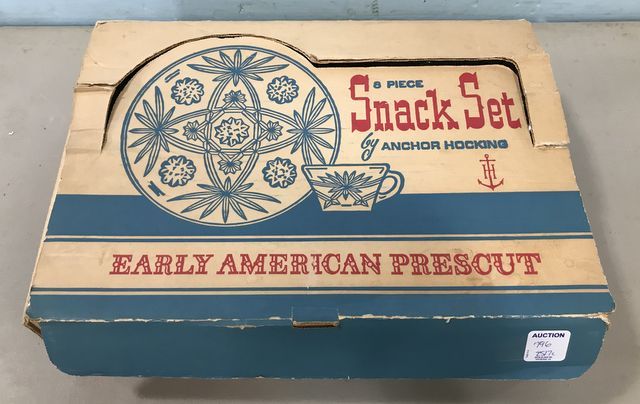 Early American Pres-cut Snack Sets by Anchor Hocking, 8 plates and cups, in original box. Early American Pres-cut Snack Sets by Anchor Hocking, 8 plates and cups, in original box.