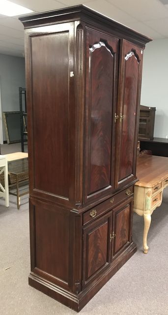 American of Martinsville Chippendale Style Entertainment Center, burl cherry finish, two piece, double doors, single drawer, one door needs adjusting, 84"h., 20"d., 38"w. American of Martinsville Chippendale Style Entertainment Center, burl cherry finish, two piece, double doors, single drawer, one door needs adjusting, 84"h., 20"d., 38"w.