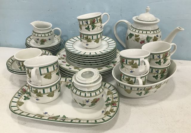 Set of Lenox "Summer Terrace" Dinnerware, 4 dinner plates, 6 salad plates, platter, dish, creamer, sugar, pitcher, 9 saucers, 8 mugs. Set of Lenox "Summer Terrace" Dinnerware, 4 dinner plates, 6 salad plates, platter, dish, creamer, sugar, pitcher, 9 saucers, 8 mugs.